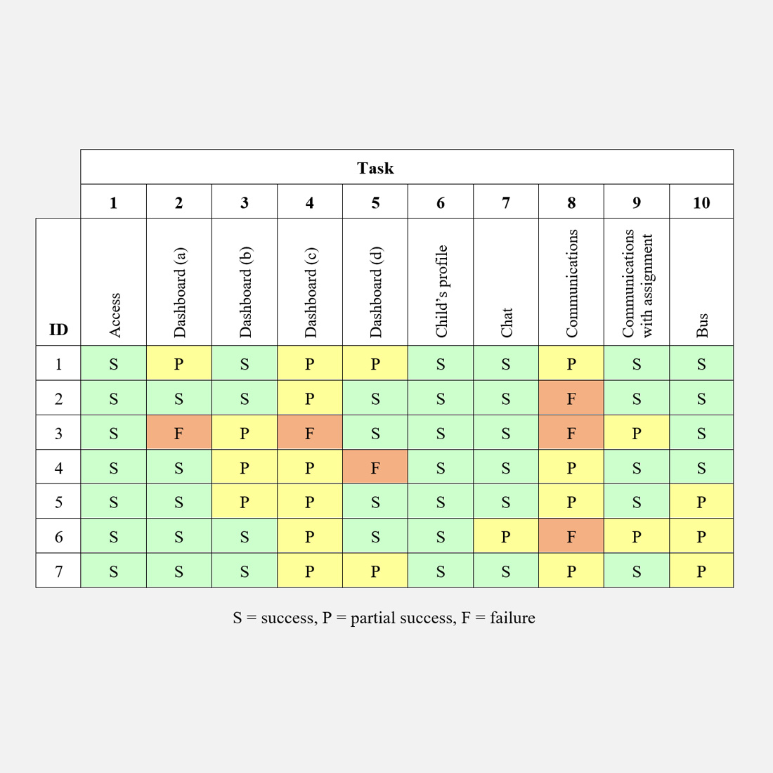 The task success rate refers to “the percentage of tasks that users complete correctly” as defined by Nielsen and for each task goal. Each task completed in which the moderator intervened by providing information or suggesting actions was recorded as (P) “partial success”. Sometimes the user was stuck even after the intervention of the moderator and it was decided in these cases to record the task as (F) “failure” rather than forcing the user to complete the task.