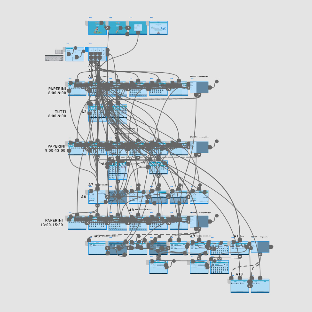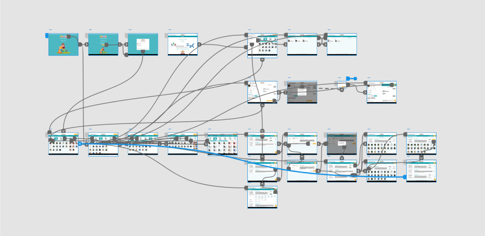 The prototype has been developed with Adobe XD. The first workspace refers to a version of the prototype (November 2019) presented by me in one of the meetings with the project manager. The second workspace, in “prototype view”, refers to the updated prototype (January 2020) according to the descriptions of the tasks for the usability tests, to allow the participants to properly interact in the different areas of the mobile app during the test. The image shows the increased complexity of the interactive prototype for the usability test in comparison to the previous version.