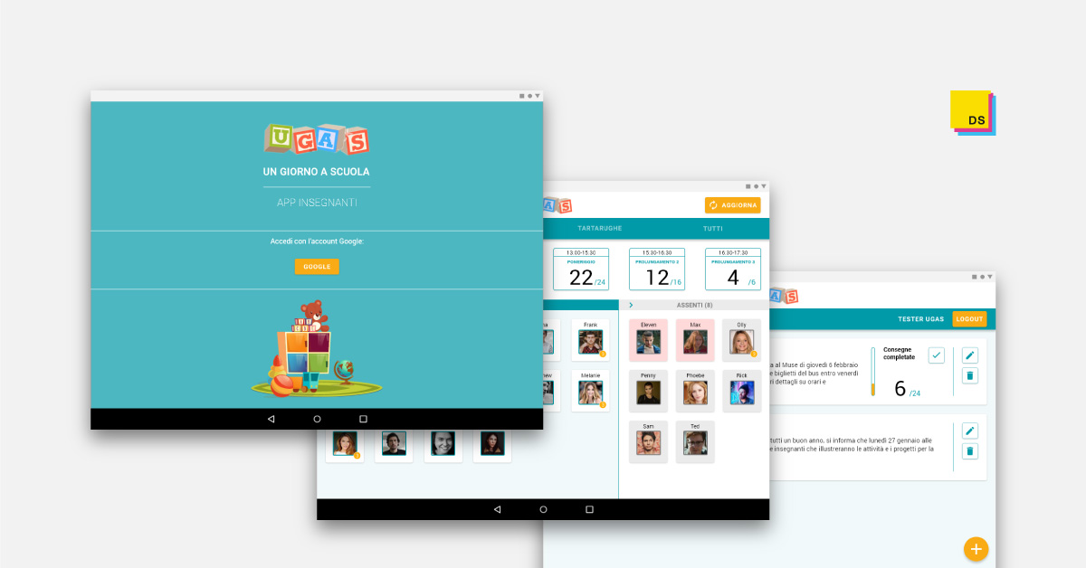 The UGAS – Un Giorno A Scuola (i.e. A Day At School) system, developed by FBK − Fondazione Bruno Kessler, aims to improve daily communication between teachers and parents of children enrolled in Italian kindergartens. The mobile apps, one for parents and one for teachers, allow sharing information to simplify and make more efficient the management of the daily presence and the activities of children at school.