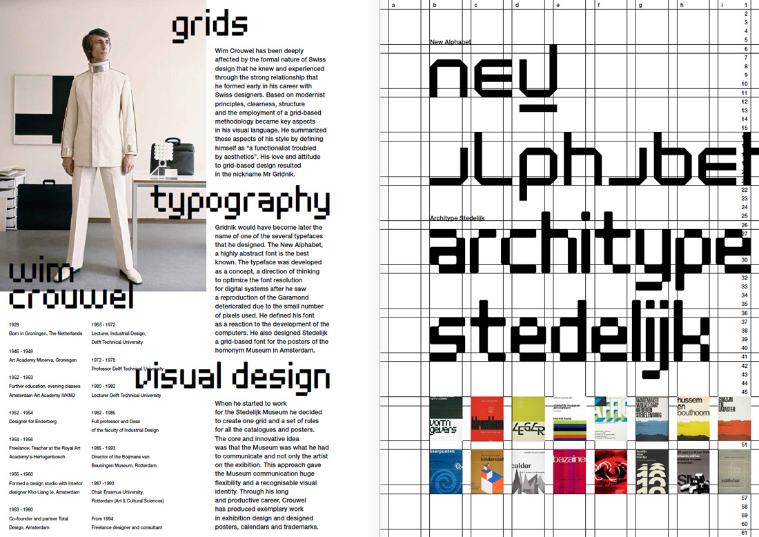 My research focused on the Dutch designer Wim Crouwel (“Mr Gridnik”) and I tried to pay tribute with a booklet with respect to his style based on modernist principles, clearness, structure and the employment of a grid-based methodology.